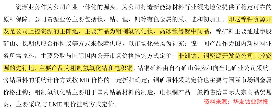 公司资源业务的核心是“印尼镍钴”和“非洲钴铜”两大阵地,印尼是全球最大的镍生产国,而刚果(金)供应链全球约76%的钴,华友钴业通过在此布局从源头上锁定资源。