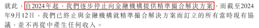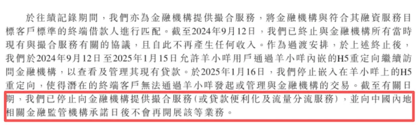 “截至2024年9月12日,我们已终止与金融机构所有当时现有与撮合服务有关的协议,且自此不再产生任何收入。作为过渡安排,于上述终止后,我们于2024年9月12日至2025年1月15日允许羊小咩用户通过羊小咩内嵌的H5向继续访问金融机构,以查看及管理其现有贷款。于2025年1月16日,我们停止嵌入在羊小咩上的H5复位向,使得潜在的终端客户无法通过羊小咩发起或管理与金融机构的交易。截至有关日期,我们已停止向金融机构提供撮合服务(或贷款便利化及流量分流服务),并向中国内地相关金融监管机构承诺日后不会再开展该等业务。”