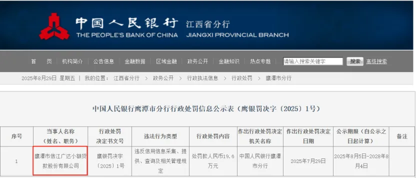 2025年7月29日,中国人民银行鹰潭市分行对“鹰潭市信江广达小额贷款股份有限公司”,作出行政处罚决定:因其违反信用信息采集、提供、查询及相关管理规定,处罚款人民币19.6万元。