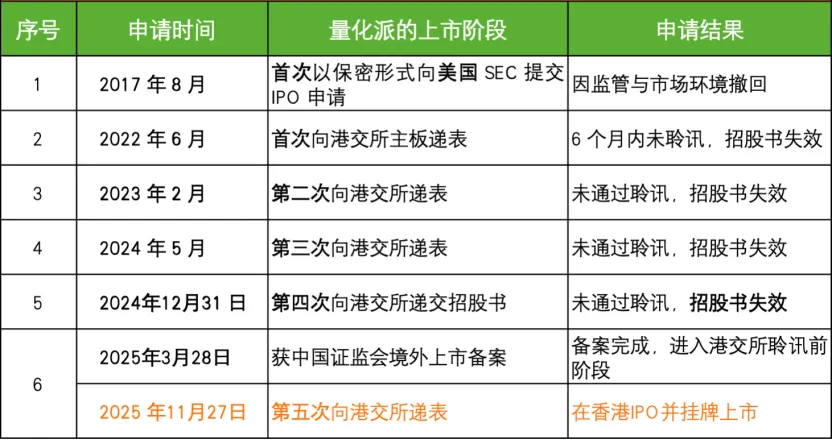 2025年11年27日,量化派经过6次上市申请(1次美国、5次香港),在第六次成功“鸡肋募资”上市了。