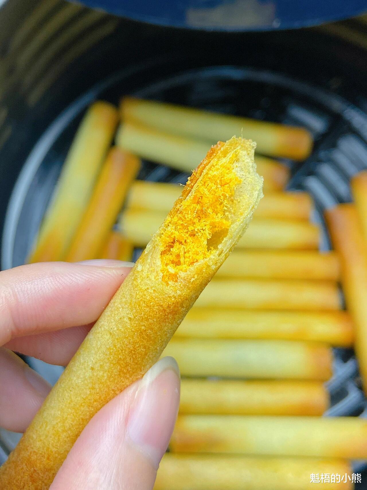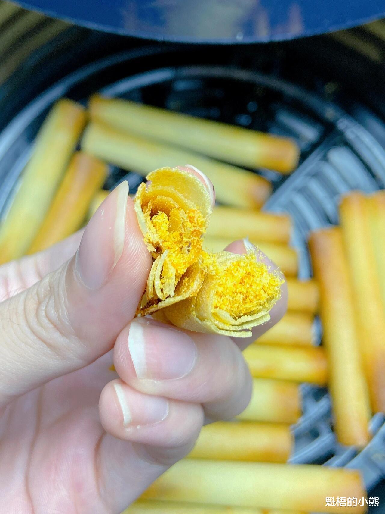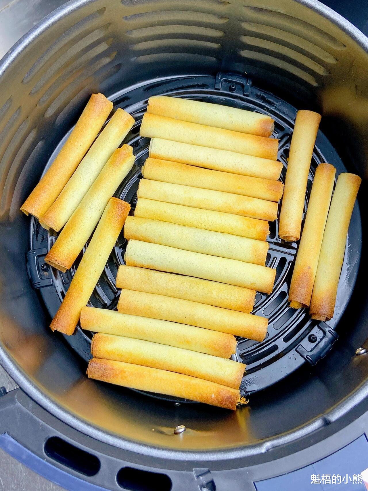 做法更是零难度。小米煎饼用剪刀剪成手掌大小的片(别太大,方便卷制),撒上混合好的馅料,薄薄一层就好,放太多容易漏馅。从一端卷起来,尽量卷紧一点,尾部抹点鸡蛋液粘住封口。空气炸锅调至160度,烤5分钟。听着锅里滋滋作响,看着煎饼慢慢变成金黄色,香气直往外冒。5分钟一到,拉出来——金灿灿的蛋卷,轻轻一碰就掉渣。