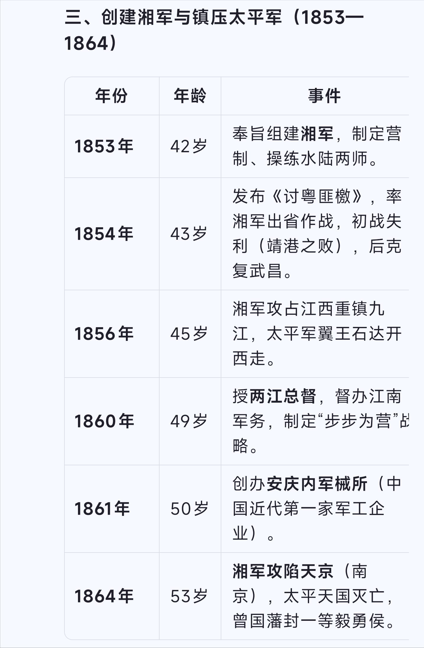 曾国藩真正发迹还是起于组建湘军,1851年太平天国起义爆发后,清政府的八旗和绿营军战斗力极差,根本不是太平军对手,1853年南京被攻破,震动清廷,咸丰皇帝一下急眼了,急需一支新的军事力量,1852年曾国藩已回湖南老家为母奔丧,此时恰遇太平天国攻打湖南,清政府索性就命曾国藩在湖南募集乡勇,团建新军,就是后来的湘军。曾国藩就是靠这支自己拉扯起来的湘军灭了太平天国。