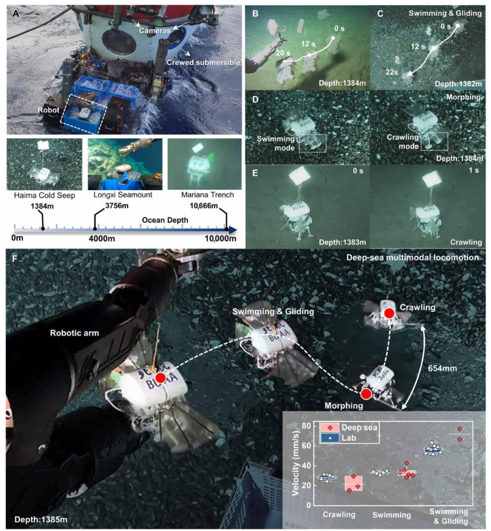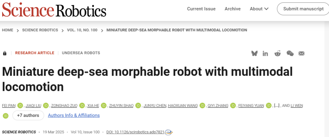 引文格式:Pan F, Liu J, Zuo Z, et al. Miniature deep-sea morphable robot with multimodal locomotion[J]. Science Robotics, 2025, 10: eadp7821.