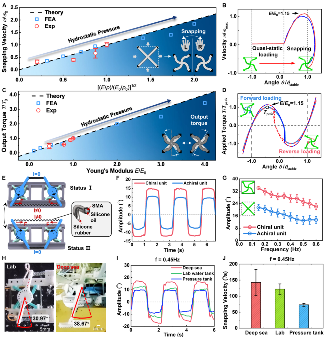 为了实现周期性摆动,他们把两个形状记忆合金(SMA)弹簧和一对镜像的手性单元组合起来(图1E)。SMA弹簧通电收缩,提供触发扭矩。图1F-G显示,与无手性的对照组相比,这个设计让摆动幅度平均提升了71.6%。更重要的是,在模拟深海环境(4°C,40 MPa)测试中,单元的摆动幅度和速度反而比常温常压下更高(图1I-J),验证了“越深越强”的猜想。