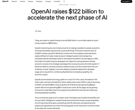 美国当地时间3月31日,OpenAI对外公布完成了一轮私募融资,这是硅谷迄今规模最大的一轮私募融资,融资总额达1220亿美元,融资完成后其估值为8520亿美元。