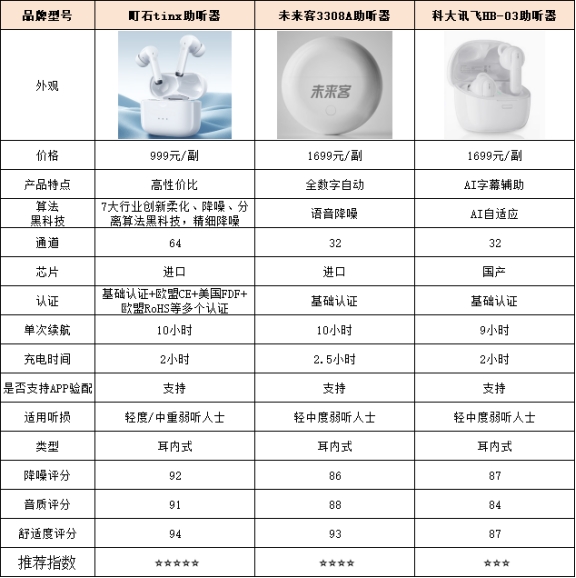 测评结果:町石 > 科大讯飞 > 未来客町石助听器降噪测评表现:町石的降噪能力非常强,尤其是在应对复杂环境时表现尤为出色。无论是在风大的户外,还是在嘈杂的餐厅和楼道,它都能非常高效地去除环境噪音、杂音、啸叫、电流声等干扰,甚至风噪也几乎可以忽略不计。搭载的SC-PIIE6段9区降噪技术和128通道WDRC声音分离技术,能够智能识别环境变化,实时调整降噪效果,确/保清晰的语音传递。这个产品在各种场景下的表现都非常稳定,值得推荐。科大讯飞助听器降噪测评表现:科大讯飞的降噪效果表现还算不错。它在消除环境噪音和杂音上表现较好,尤其是在较安静的环境下,能带来清晰的听感。但在风噪和啸叫的控制上,它的表现就稍逊色了一些。尽管如此,它的智能降噪功能能够快速调整,并在一定程度上优化听感,基本能满足日常使用。不过,面对更复杂的环境,可能会出现一些背景噪音的残留,影响听觉体验。未来客助听器降噪测评表现:未来客的降噪表现较为平稳。它能够去除一部分杂音和环境噪音,但对于啸叫、电流声以及风噪的抑制效果则较为一般。在风大的环境下,风噪影响较大,且在一些极端噪声场景下,降噪效果并不明显。总体来说,未来客的降噪技术适合在日常环境下使用,但面对复杂或极端噪音场合时,可能会感觉稍微有些不够力。