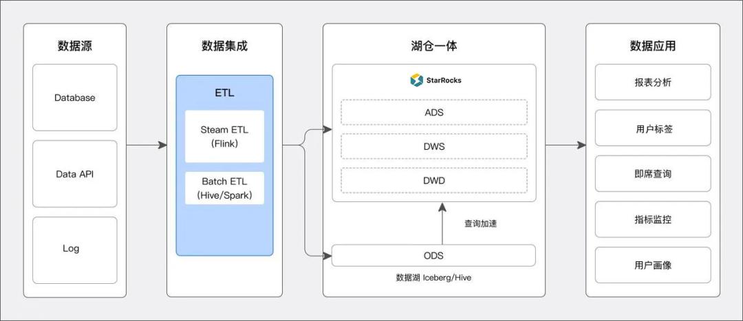 数仓分层存储: 将数据实时写入 StarRocks 中,所有热数据的查询均在 StarRocks 数据仓库中进行,上层数据应用在执行查询时,对于高 QPS 和低延迟要求的 SQL 直接走 StarRocks 内表。数据湖查询加速: 将 ODS 层数据写入数据湖中,DWD、DWS、ADS 层则存储在 StarRocks 中。