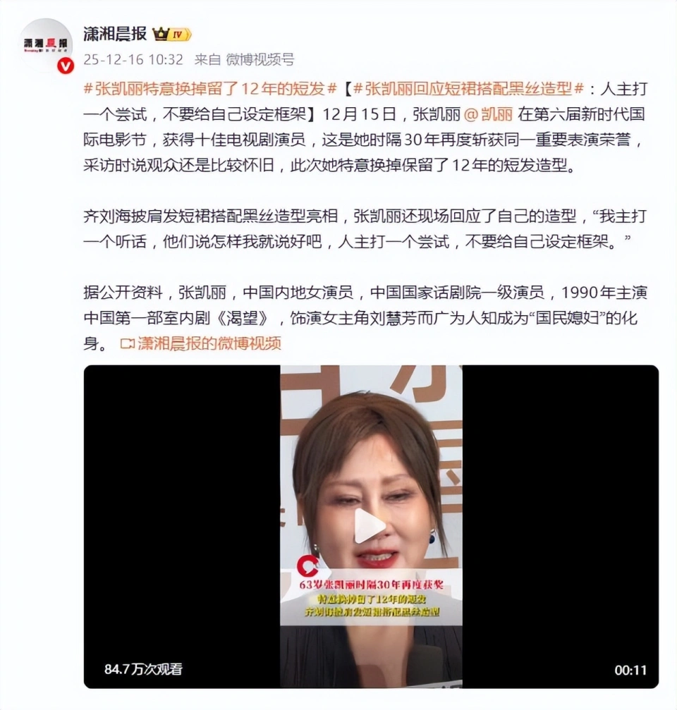 12月15日澳门第六届新时代国际电影节红毯上,63岁的张凯丽带着“十佳电视剧演员”奖杯,用一身造型炸翻热搜——齐刘海披肩发搭配黑色流苏短裙、10D微透黑丝和10厘米高跟鞋,彻底颠覆了观众心中“国民媳妇”的端庄形象。面对镜头追问,她笑着回应:“我主打一个听话,他们说怎样我就说好吧,人就得勇于尝试,别给自己设框架!”