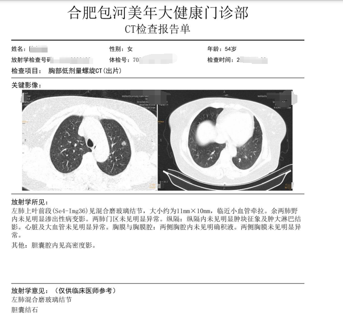 去年3月,赵女士(化名)借着女婿公司的员工体检福利,来到合肥美年大健康滨湖分院体检——赵女士女婿所在公司每年都会组织员工体检,家属也可同步享受同等体检套餐,这份藏在细节里的孝心,意外为赵女士筑牢了一道坚实的健康防线。在本次胸部低剂量螺旋CT检查中,医生敏锐捕捉到异常信号:左肺上叶前段(Se4-Img36)可见混合磨玻璃结节,大小约11mm×10mm,且临近小血管有牵拉迹象;其余肺野、肺门区、纵隔、心脏及大血管、胸膜与胸膜腔均无明显异常,仅胆囊腔内见高密度影。其中,肺部混合磨玻璃结节伴血管牵拉这一情况,立刻引起了医生的高度重视。