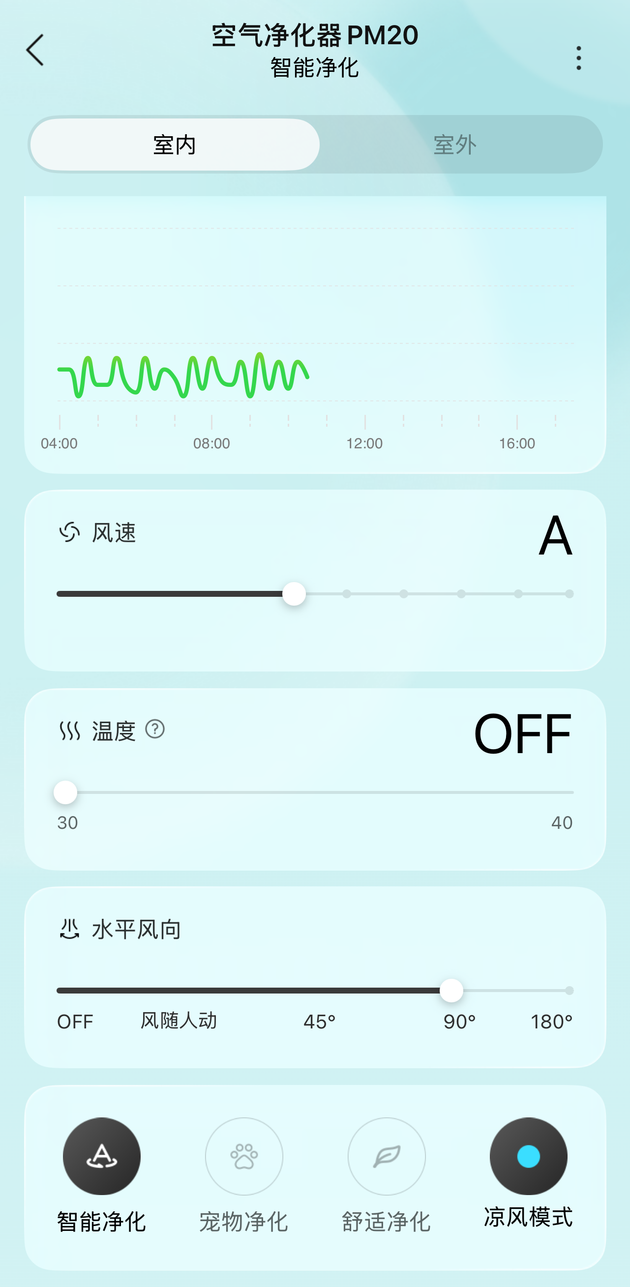 PM20搭载AI感知动态追踪技术,能够检测5米范围内的人员活动,自动开机并调整出风方向,实现“人到风到”的智能体验。通过手机APP,用户可实时查看室内空气质量曲线图,随时掌握空气状况变化。