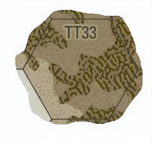 山地格:山地格采用多种深浅不一的棕色着色,用来暗示高低起伏的丘陵地形。TT33左下方的格子是纯灰色的;表明其属于开阔地形格。山地的阴影效果严格止于分隔这两个格子的六角格边界处。