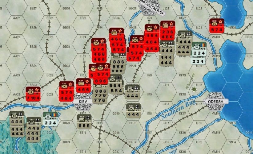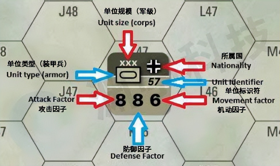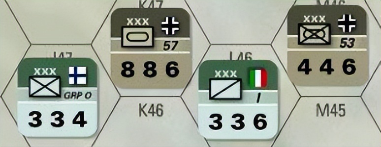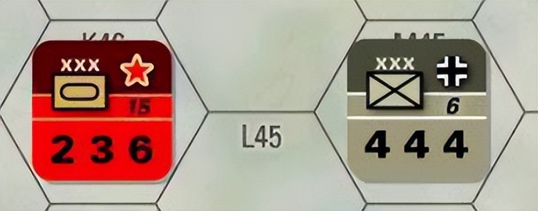 (3)每个单位底部的三个数值表示该单位的战斗和机动能力。三个数字依次表示攻击因子、防御因子和机动因子。其中,苏军单位为2-3-6,而德军单位为4-4-4,代表该苏军单位的攻击因子为2,防御因子为3,机动因子为6;该德军单位的攻击因子、防御因子和机动因子均为4。