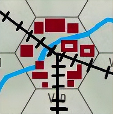注意,该格还有河流和铁路穿过,但在绘制上并不予以体现。若需体现城市、铁路、河流交汇的性质,可参照左下方的城市格绘制。