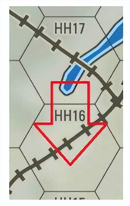 河流端点格:HH17是一个河流端点格。河流只穿过该格的一条边。从地理角度看,河流通常由未在地图上标出的溪流与支流在端点格汇合形成上游起点,并自该格向下游流出。河流的流向仅用于解释规则,对推演本身并无影响。每个河流端点只指向唯一一个相邻格。本例中,HH17的河流端点指向HH16。凡被河流端点指向的格子,在战斗规则中具有特殊效果。