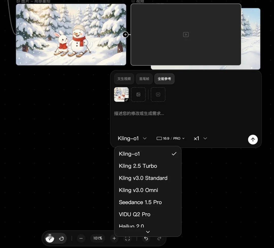 这个精调面板支持的模型也是非常多样的,做图可以用 Nano Banana,做视频可以用 Kling、Seedance、Hailuo 等优秀模型。