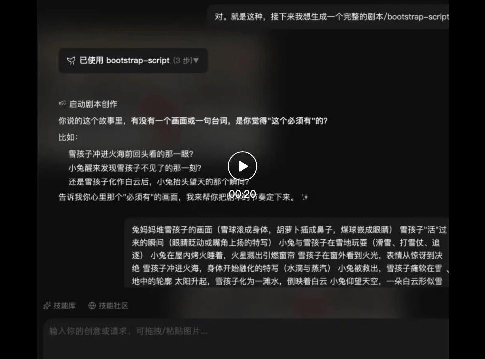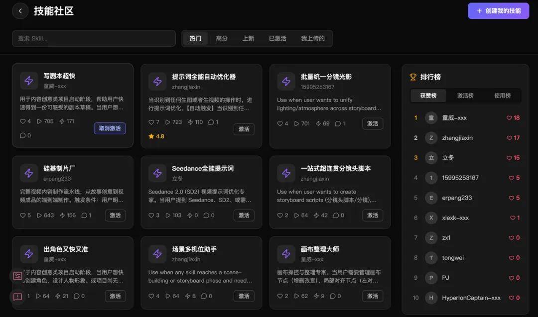 此外,我发现它还有一个 skills 社区。这个社区可是宝藏,很多大神会把自己的创作经验打包发上来,比如某种滤镜调色、排版逻辑、叙事框架,普通创作者可是有福了。当然,我们自己积累的技巧也可以打包(「创建我的技能」那个按钮),留着下次用。
