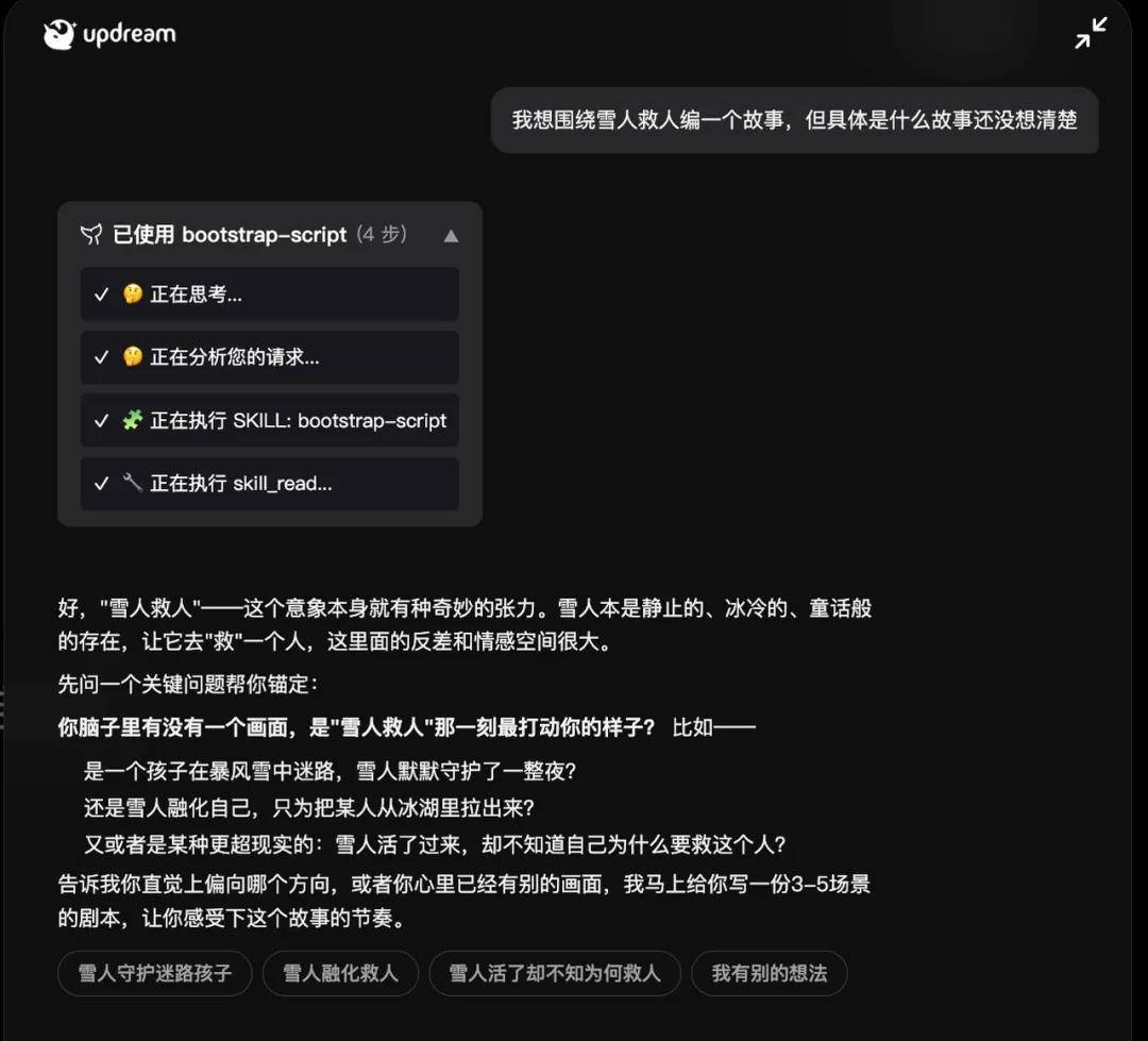 但听说,updream 用起来不一样,它不是按部就班式的,而是和创作者一起想东西,想好之后还有很多现成的 skills 可以用。而且,它还能记住创作者的风格偏好等历史信息,属于用得越多越顺手。