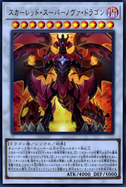 绯暗红超新星龙是暗属性龙族同步怪兽卡,星级12,攻击力4000/守备力3000,该卡作为绯暗红新星龙的进化形态登场,需使用3只协调怪兽和1只以上协调以外的同步怪兽作为素材进行同步召唤。