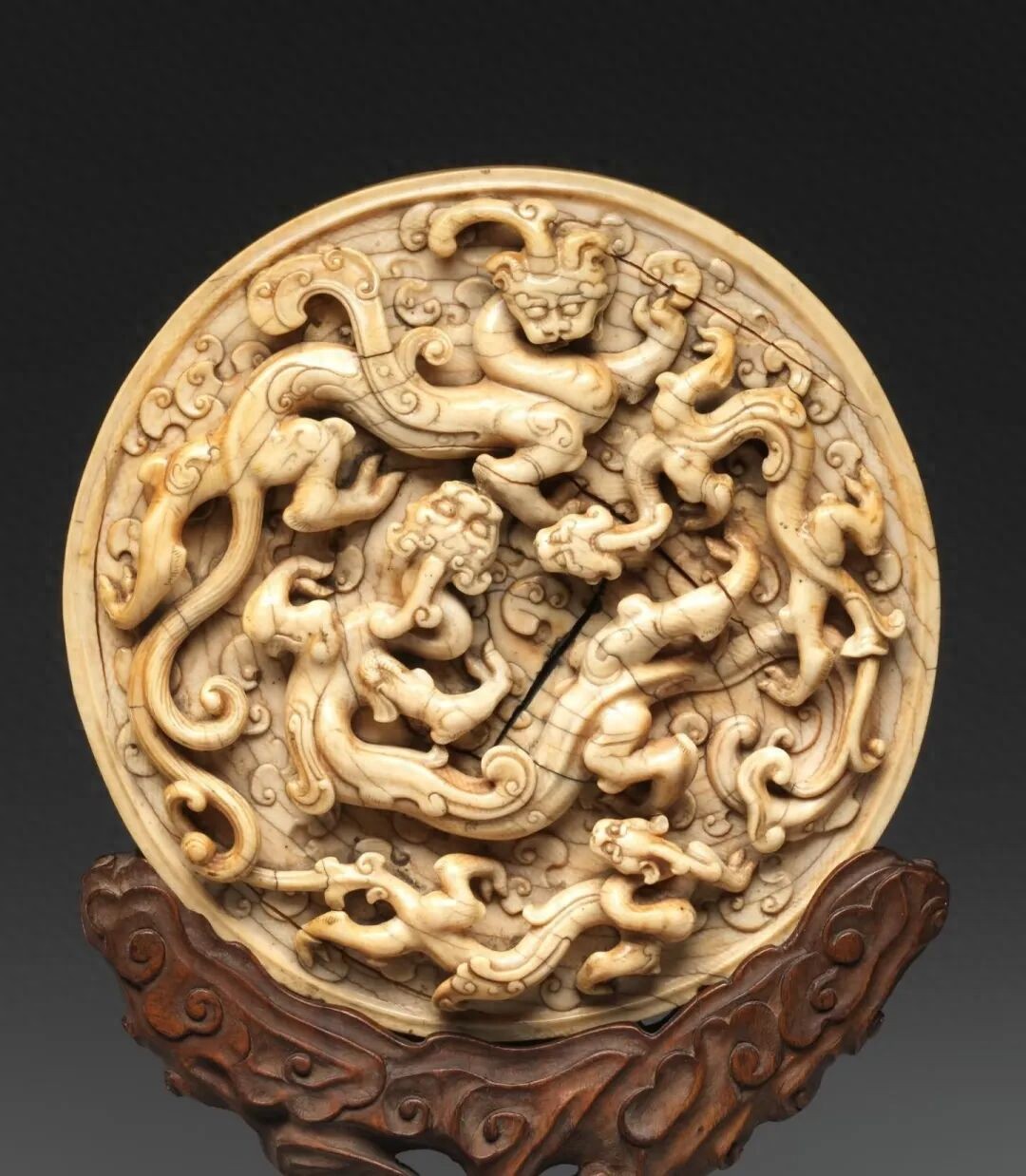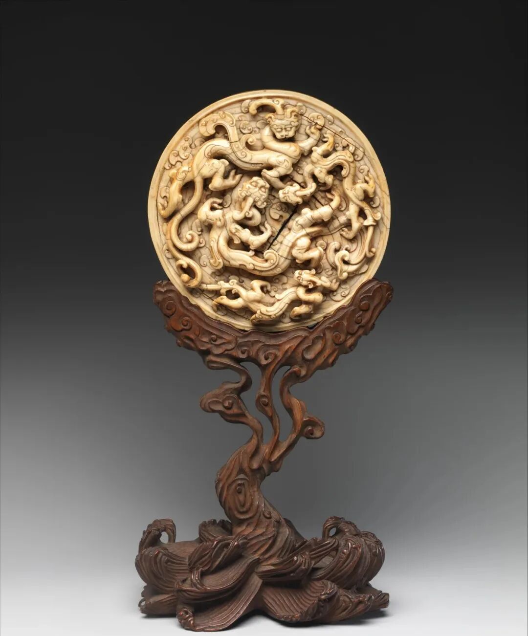 偶然间在纽约大都会博物馆看到了这款顶级宫廷牙雕螭龙圆屏,这件牙雕创作于明初。