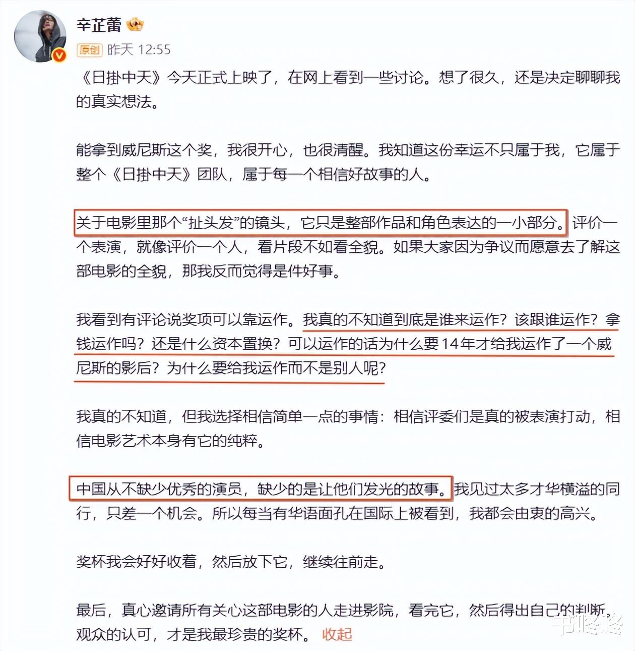 虽然截图内容尚未证实,但是“威尼斯”、“女演员、影后、”扯头发“等字眼,恰好对应上了9月7日凭借电影《日掛中天》拿到威尼斯影后的辛芷蕾。