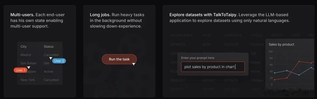 Taipy 项目的核心定位很清晰:让数据科学家和机器学习工程师能轻松构建端到端的 Web 应用。不用再苦学前端三件套,纯 Python 就能搞定从数据 pipeline 到可视化界面的全流程开发。