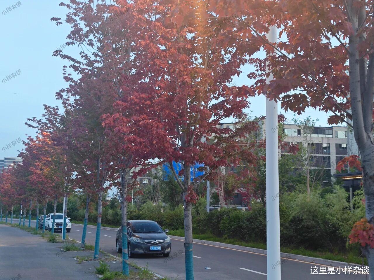 这就是沿着白沙河修建的白沙河路,整条马路种植了大量枫树和少量的银杏,两端是枫树,中间这段是银杏,而且双向四车道的马路竟然设置了绿化隔离带,隔离带上种植了多种树木,现在山楂已经红了。