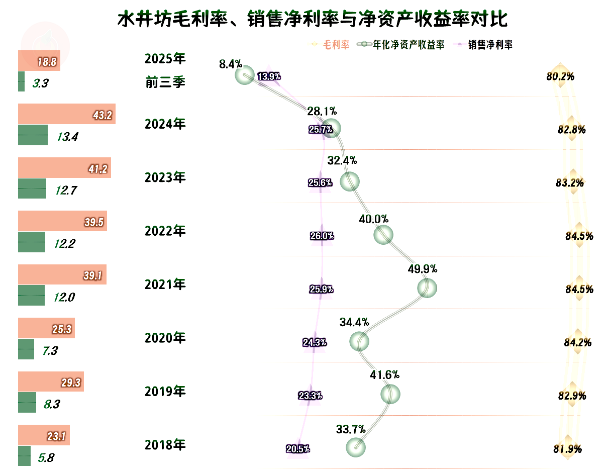 2025年前三季度的毛利率虽然比前七年都低,但仍然是超八成的高水平。由于营收的下跌,毛利额和净利润都大幅下跌,导致销售净利率和净资产收益率暴跌;别看是暴跌,仍然还算是A股中优秀级的收益水平。