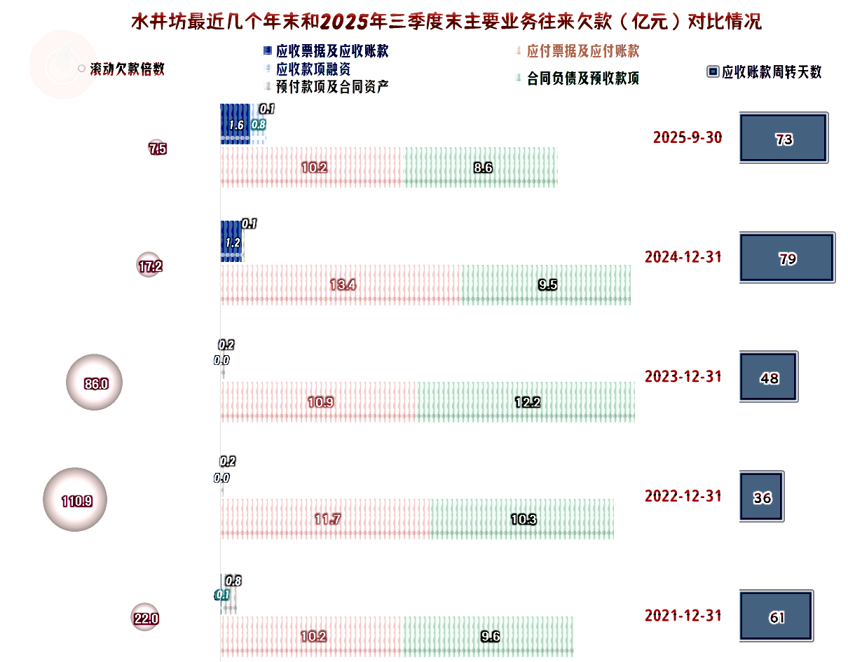 厂家处都可以欠款了,谁还想给预付款呢?毕竟经销商们的资金也不充裕。伴随着产销量的下降,水井坊的采购量当然也要下降,就算采购合同的付款条件不变,应付票据及应付账款也在下降。在2022年末时,占用别人的资金是别人占用其资金的111倍,现在开始拉清单“还账”了。