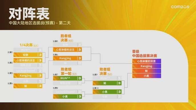 次日的对决相比首日更加激烈,几乎场场鏖战至决胜局,比分在3:2间频频出现,让人直到最后一刻都无法预判结果。“心宽体瘦的淡言”几乎不给对手任何机会,一路高歌锁定晋级资格;黑马选手“Kangjing”则成为赛场最大惊喜,他在焦点之战中以绝对优势击败两届冠军“鮭”,不仅震惊全场,也让外界对他在决赛中的表现充满期待;“鮭”则在败者组重整旗鼓,展现了冠军底蕴,成功拿到一张决赛门票;“小黑”同样通过败者组奋力突围,最终跻身决赛行列。