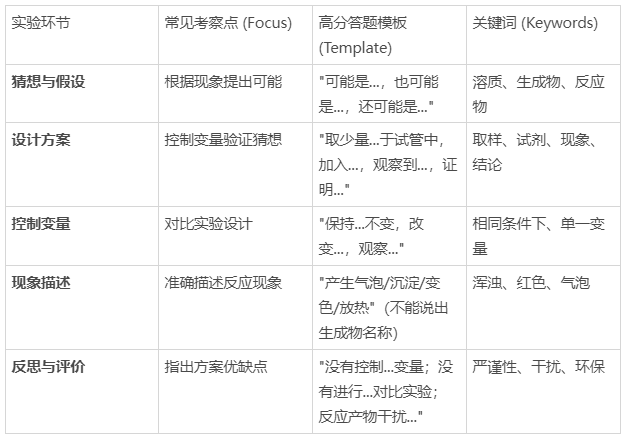 实验探究题核心答题模板 (Smart Templates)武汉中考化学实验题往往涉及猜想与假设、设计实验方案、解释与结论等环节。以下是针对不同环节的标准化答题模板: