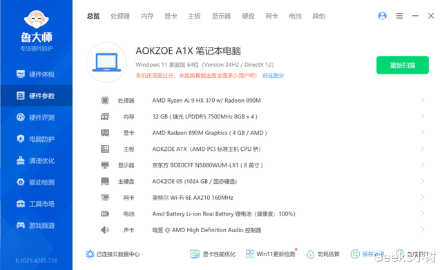 重点来啦!前面咱们简单提过,AOKZOE A1X有8840U和HX370两个版本可选。而我手上这台性能小钢炮,搭载的可是AMD最新锐龙AI 9 HX 370处理器,拥有4个大核和8个小核,共12核心24线程。更厉害的是,它还配备了基于RDNA 3.5架构的Radeon 890M核显,这配置简直就是“掌圈”的全能选手。
