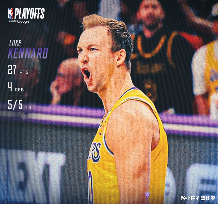 湖人的首轮G1卢克-肯纳德发挥亮眼,他赛后被誉为‘卢克魔法’。相信大家都知道东契奇有个绰号是‘卢卡魔法’,如今东契奇在场下挥毛巾看着另一个魔法师发挥。肯纳德此役38分钟,13中9,三分5中5,罚球6中4,拿到27分4篮板3助攻,命中率69.2%,三分命中率100%,真实命中率86.3%。