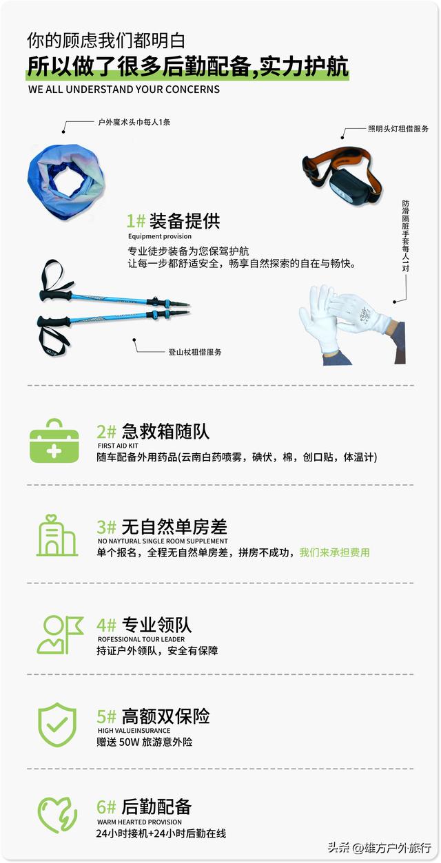 4.活动提供装备中说明的:头灯/登山杖各一件免费租借(用后回收,如需要双杖请提前告知),赠送头巾/手套(不回收)