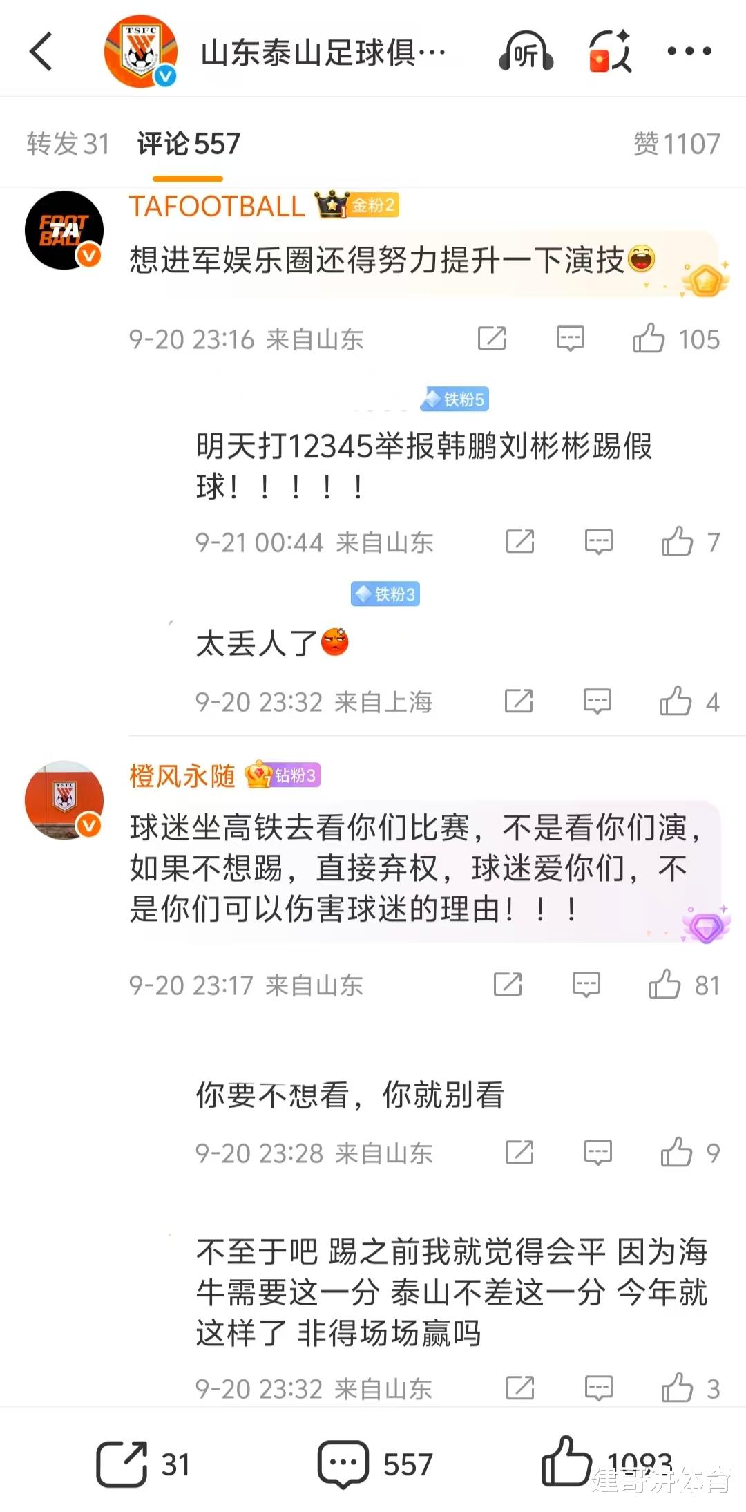 当青岛海牛队成功了逆袭了比赛读秒绝平了山东泰山队后,泰山队官网更新赛果的动态,似乎也让泰山球迷找到了发泄的地方,有很多疑似泰山队的球迷直接在泰山队官网下留言,让韩鹏和刘彬彬成为了泰山队官网下的主角,韩鹏和刘彬彬为啥让这么多的泰山球迷不满意,从山东媒体大V的留言中似乎能够找到答案。