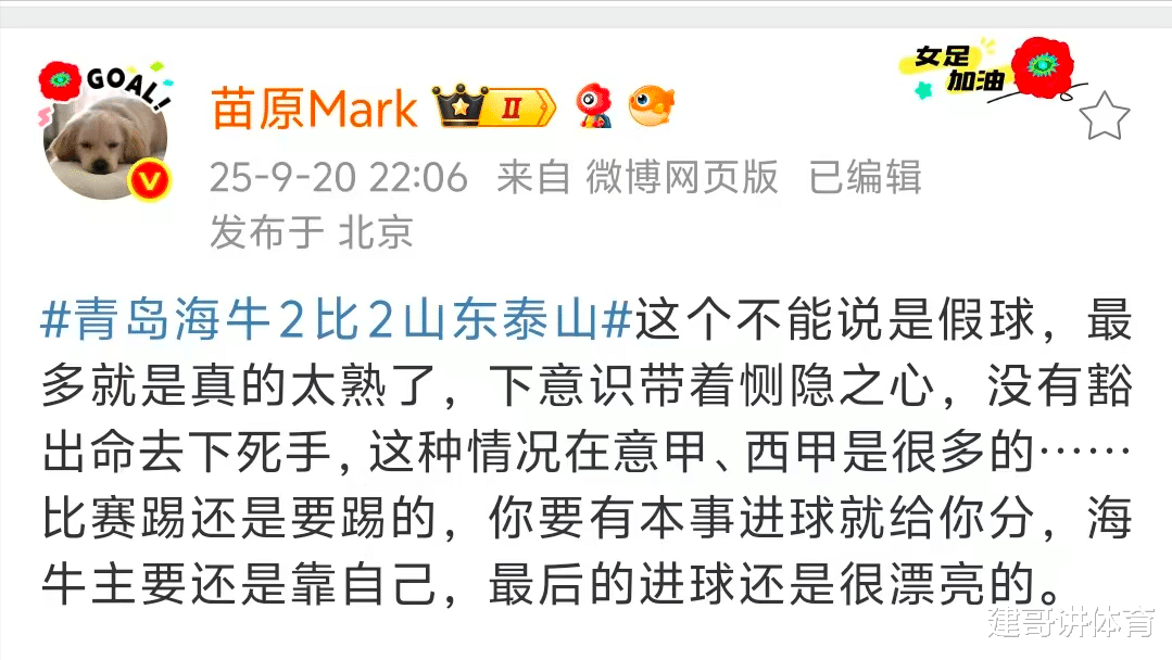 北京时间9月21日,在山东泰山队客场踢平青岛海牛队后,这场平局虽然对山东泰山队没有太多的影响,但对于青岛海牛来讲,这一分真的太关键了,其实这场比赛从比赛没有开始前,就似乎传递出了一个友好的信号,泰山球员刘彬彬看到宋龙时笑得合不拢嘴,韩鹏跑着找李霄鹏拥抱的画面,都被球迷看在眼中。