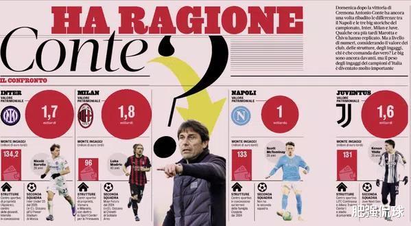 不过在本轮联赛的赛后发布会上,当记者问到为什么那不勒斯无法真正掌控比赛时,孔蒂回答道:原因有很多。这是一条刚刚开始道路,从整体结构层面来说我们还没准备好。以我看来,尤文、国米和AC米兰在结构、二队配置、薪资总额以及资产价值方面,都与其他球队不同。每当不是这三支球队中的一支夺冠,那就意味着完成了一项非凡的成就。我们试图在球场上弥补这种差距,但必须承认,这些球队本身就处在不同的层级。