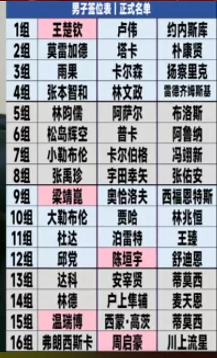 梁靖崑与奥恰洛夫一组,出线压力较大!