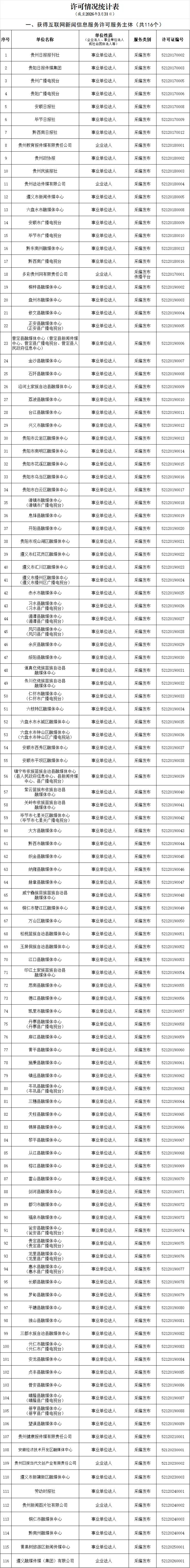 自2017年6月《规定》实施以来,贵州省互联网信息办公室依法组织开展了许可审批相关工作。截至2026年3月31日,经贵州省互联网信息办公室审批的互联网新闻信息服务单位总计116家,具体服务形式包括:互联网站48个,应用程序68个,公众账号541个,共计657个服务项。