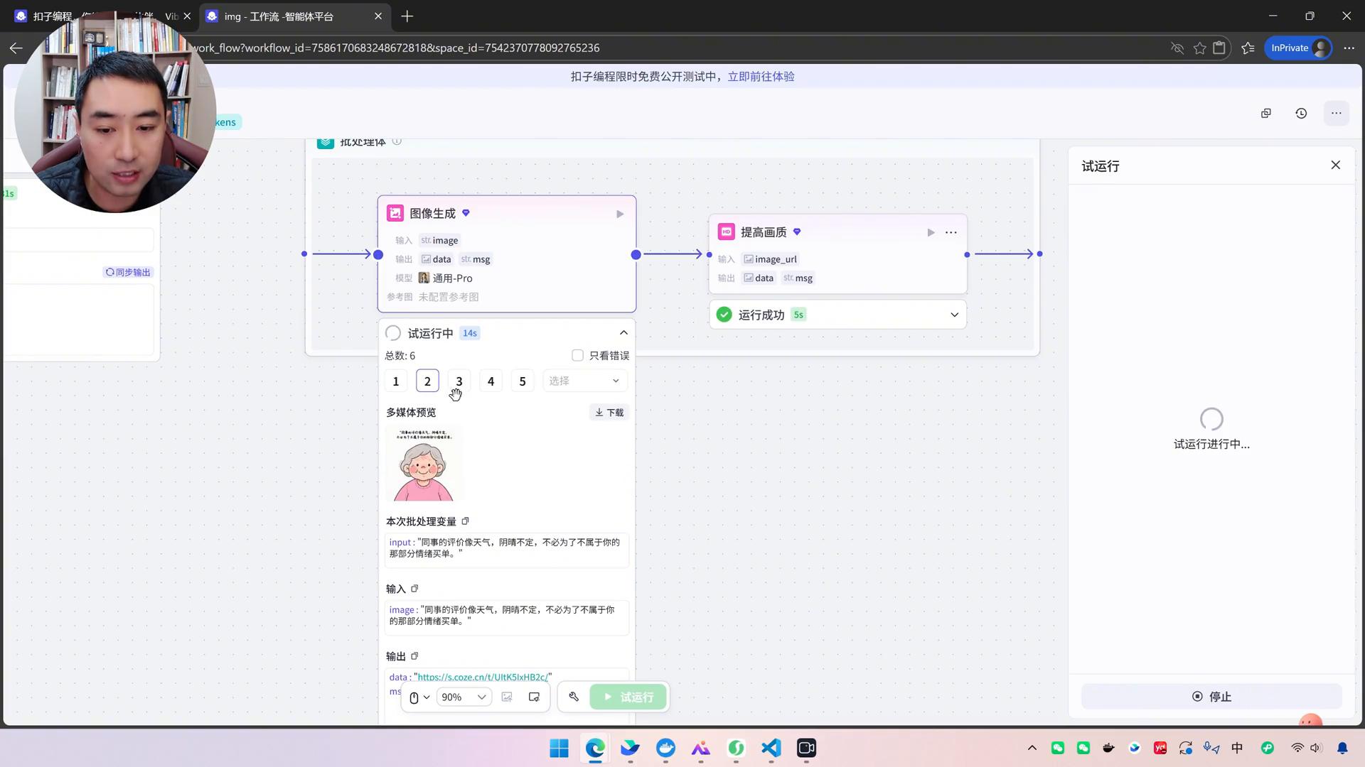 这个工作流就来到了这样的一个页面里面,这时候就实现了不需要充会员,也可以将别人的工作流导到自己的工作流里面了。当然这个时候也可以去试运行,看一下执行的效果。比如这是批量进行图片生成的一次,生成十张治愈老奶奶图片的工作流,尝试去执行一下。比如输入一个主题就叫做上班,点击试运行,看它能不能正常执行。
