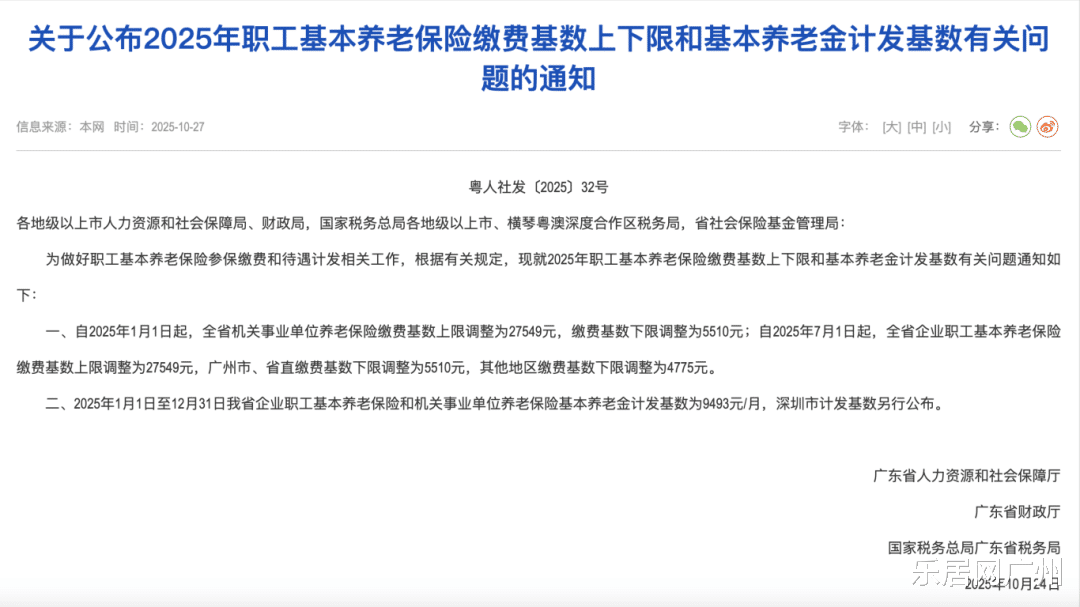 近日,广东省人力资源和社会保障厅、广东省财政厅、国家税务总局广东省税务局发布通知,对2025年职工基本养老保险缴费基数上下限和基本养老金计发基数进行明确。