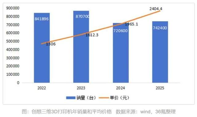 据36氪统计,2022—2025年,公司3D打印机的平均售价从1306元增长至2404元,但销量却从84.2万台跌至74.2万台,降幅达12%。