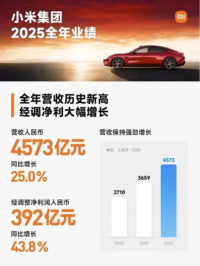 小米2025年财报出来了,数字相当亮眼:全年总营收4573亿元,同比增长25%;经调整净利润392亿元,同比增幅43.8%,两项核心指标均刷新历史纪录。