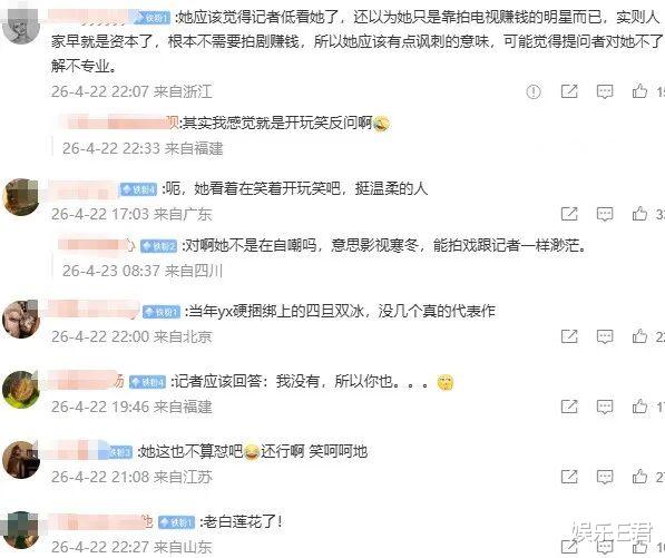 但也有网友认为:“她应该觉得记者低看她了,还以为她只是靠拍电视赚钱的明星而已,实则人家早就是资本了,根本不需要拍剧赚钱,所以她应该有点讽刺的意味,可能觉得提问者对她不了解不专业。感觉就是开玩笑反问。”