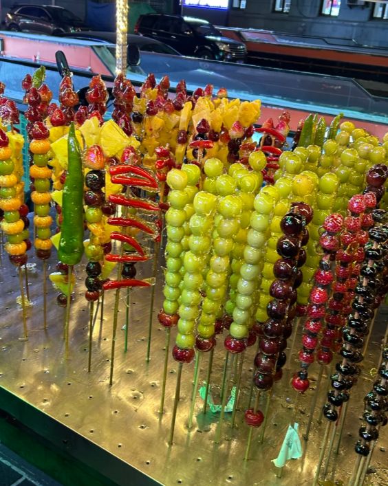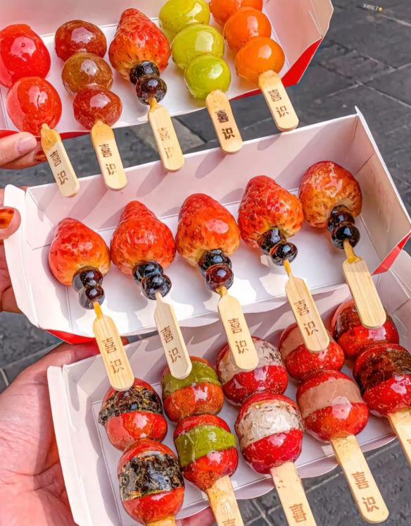 迅速将串好的水果在糖浆中快速滚一圈,让每一颗水果都均匀裹上糖衣,然后放在抹了油的案板上冷却。不一会儿,晶莹剔透、香甜可口的冰糖葫芦就大功告成了。咬上一口,“嘎嘣”一声,糖衣的酥脆和水果的酸甜在口中交融,满满的幸福感。掌握好熬糖火候,你也能轻松做出媲美街头的冰糖葫芦。