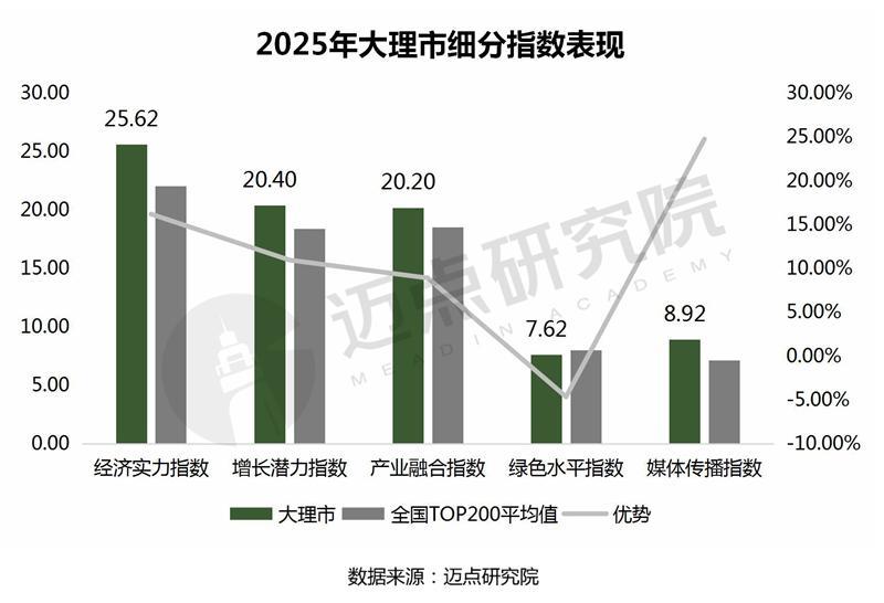 大理CTDI总排名位列全国县域榜首。经济实力为25.62,远超平均,表明其文旅产业已形成强大的经济贡献和成熟的消费市场。增长潜力20.40,显著领先,显示其未来仍被持续看好,发展后劲充足。产业融合20.20,高于平均水平,证明其“文旅+”模式行之有效,产业链不断延伸。绿色水平7.62,略低于平均,这既是其作为热门旅游目的地面临的环保压力,也是其未来必须补强的关键短板。媒体传播8.92,占据绝对优势,是其最核心的竞争力之一,表明大理已成功占据公众心智,成为现象级的“网红”目的地。大理在四项关键指标上均大幅领先,尤其在媒体传播和经济实力上建立了“护城河”,其“全能冠军”的形象并非仅靠单一优势,而是综合实力的体现。