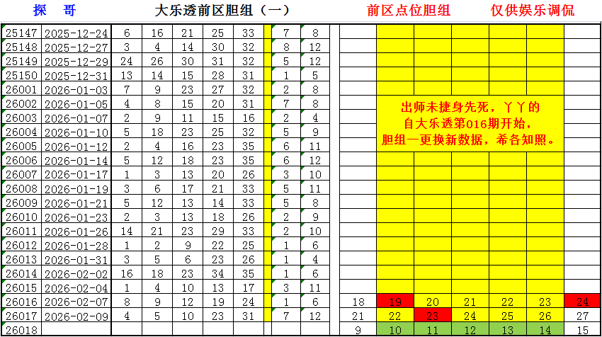 出师未捷身先死,自大乐透第016期开始,胆组一更换新数据,希各知照。