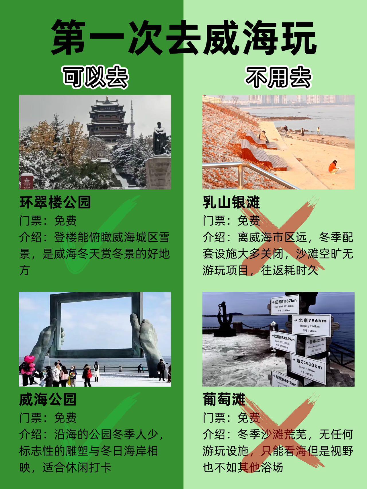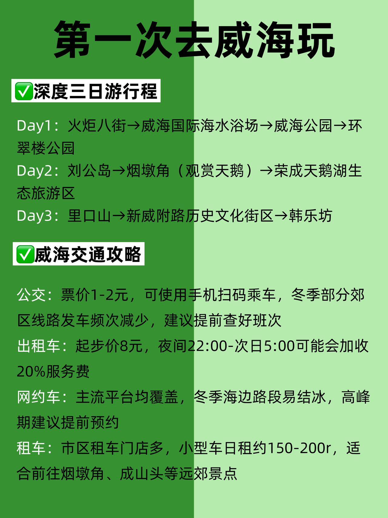 ⚠️敲重点:冬季威海公交郊区线路发车少,出门前一定要查好班次;海边路段易结冰,打车或网约车都建议提前约,防晒也别忘,海边紫外线还是强❗