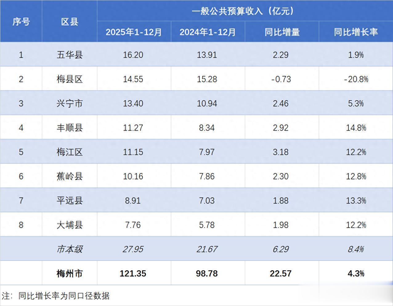 根据统计部门公布的数据,2025年1-12月份,梅州全市共实现一般公共预算收入121.35亿元,较上年同期增长4.3%。其中市本级收入27.95亿元,同比增长8.4%;区县收入合计93.39亿元,同比增长3.1%,具体情况如下: