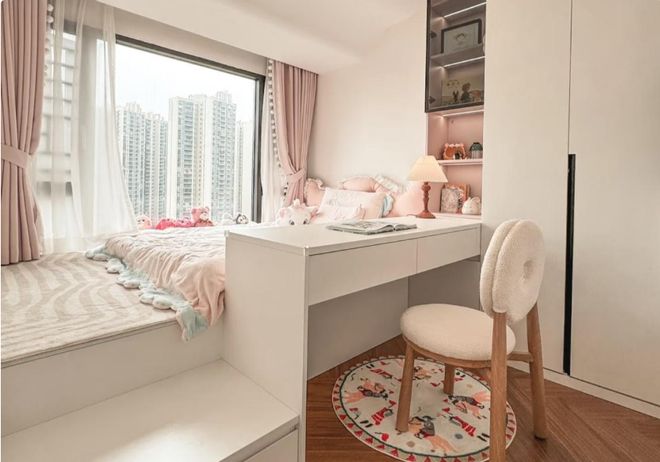 完成以后你会发现,飘窗不再是独立的区域了,而是变成了榻榻米的一部分,整个房间的布局浑然一体,干净又利索。