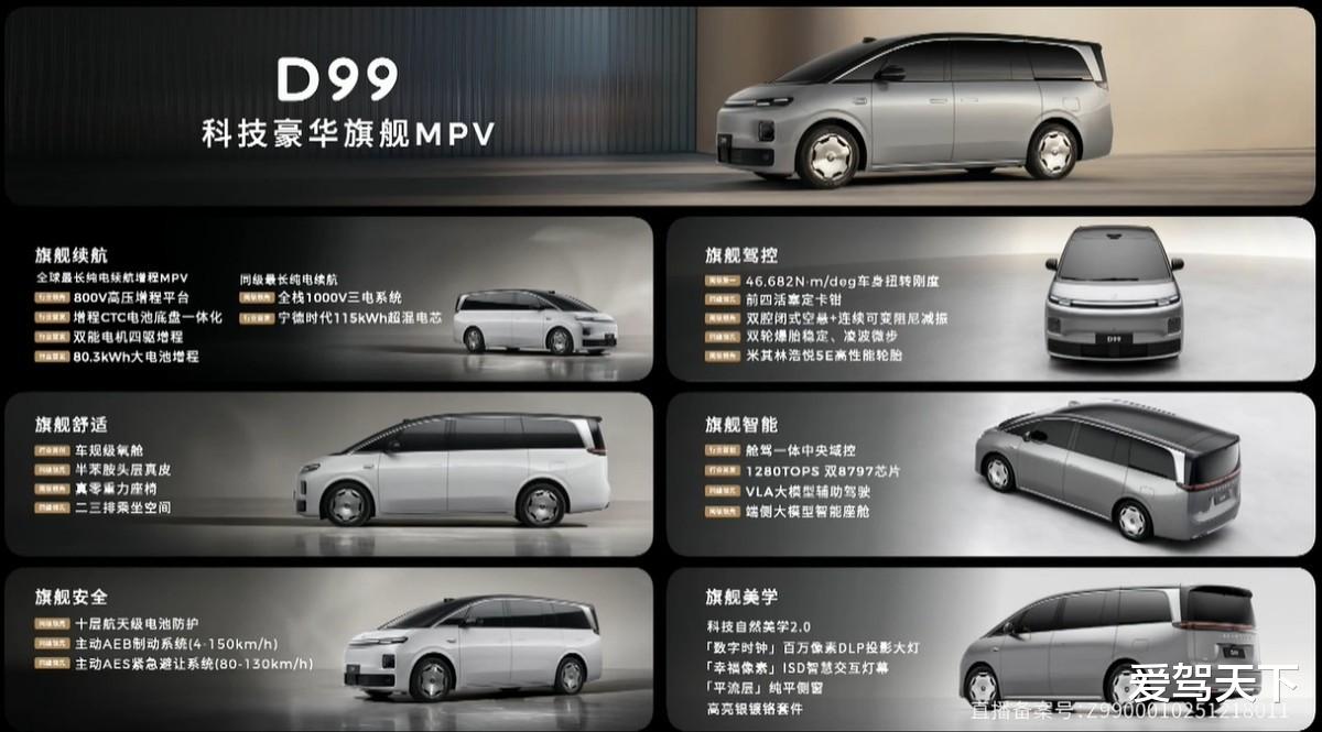 作为旗舰级MPV,零跑D99在配置上也丝毫不吝啬,半苯胺头层真皮内饰、零重力座椅、双高通骁龙8797芯片、端侧AI大模型、VLA大模型辅助驾驶、双腔闭式空悬、连续可变阻尼减振器,以及前四活塞卡钳等豪华配置均会提供。